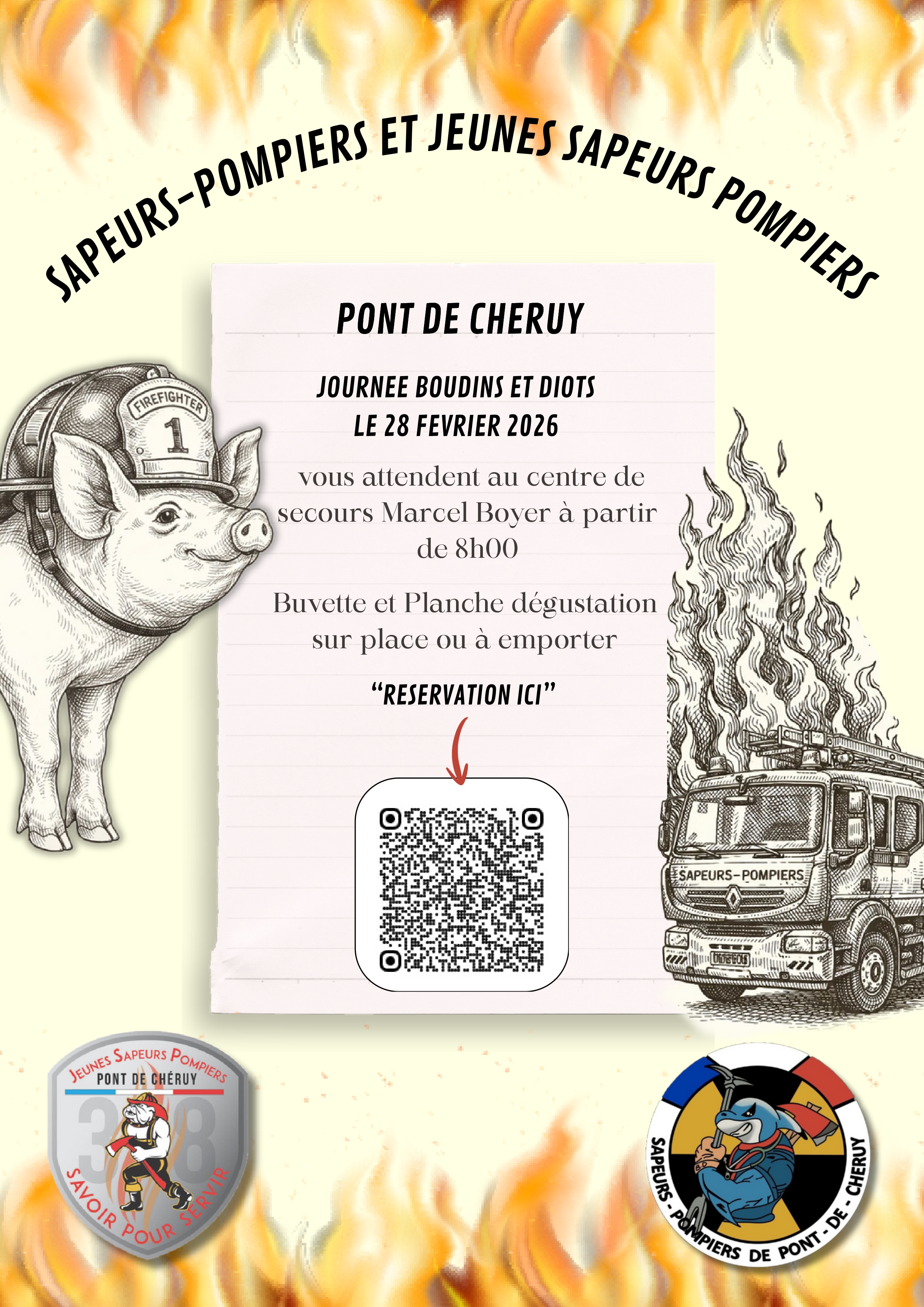 Les Sapeurs-Pompiers de Pont de Chéruy organisent leur vente annuelle de boudins et diots :SAMEDI 28 FÉVRIER 2026